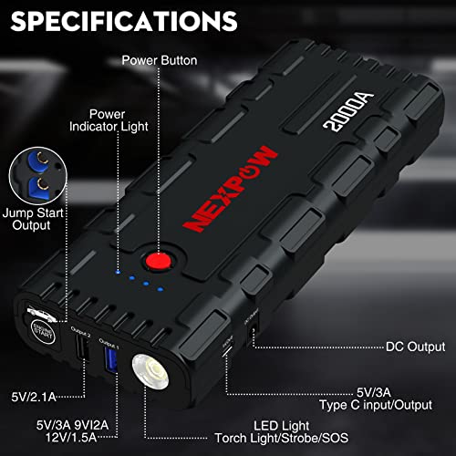 - Supercapacidad y pico: el arranque automático de NEXPOW utiliza u batería de polímero de alta velocidad en lugar de un arrancador normal, que proporcio una gran capacidad arrancar fácilmente un vehículo de 12 V ha 20 veces (ha motor de gas de 7.0 L o diesel de 6.5 L). Incluso si la batería del coche está muerta, tbién puede reiniciar el vehículo.