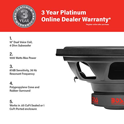 Detalles: BOSS Audio Systems CXX104DVC - Subwoofer para coche (potencia máxima de 1000 W, 10 pulgadas, bobina de voz dual de 4 ohmios, se vende por unidad)