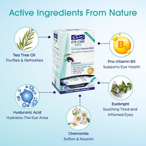 Detalles: Descripción Tamaño:30 Wipes Las toallitas extra para ojales de Dr. Fischer proporcionan alivio instantáneo de cualquier tensión ocular e irritación. Limpia de forma fácil y eficaz tus ojos de aceite, residuos, suciedad, polvo, maquillaje, materia crusta, mucosa ocular gruesa, secreciones oculares y cuerpos extraños. Alivio inmediato para aquellos que sufren de blefaritis, conjuntivitis, ojos rojos, ojos secos, inflamaciones oculares y estilos. Úsalo como una ayuda complementaria para el tratamiento médico como las gotas de conjuntivitis o las pomadas de los ojos y da a tus ojos la mejor oportunidad para combatir infecciones bacterianas o virales. Hay algo más que que satisfacer el ojo. Mantener los ojos saludables requiere una solución equilibrada y completa. Cuidado Eye-Care Dry proporciona a tus ojos una respuesta fácil y cómoda a las necesidades más comunes: mojado e hidratado. Mantiene tus ojos bien lubricados y húmedos. Mojado y cómodo: ayuda a calmar y aliviar infecciones, irritaciones y molestias oculares. Propiedades húmedas e higiénicas antiadherentes para proteger los ojos de los desechos transportados por el aire y mantener la higiene de la piel. Mojado y limpio: proporciona una limpieza suave y profunda para un mantenimiento saludable de los ojos, húmedo y limpio. Refresca la superficie de los ojos dándole una visión nítida y clara. Única fórmula creada específicamente para aliviar y proteger tus ojos. Enriquecido con: Eyebright (Euphrasia) - un antioxidante de hierbas conocido por su actividad contra los radicales libres y por sus propiedades calmantes Teflos- incorpora propiedades antiadherentes para mantener los ojos, los párpados y las pestañas limpias de contaminantes extranjeros y mantener la comodidad de los ojos. El ácido hialurónico para hidratar e hidratar el aceite de árbol de té ayuda a purificar y refrescar el entorno de los ojos Chamomile y Pro-Vitamina B5 para calmar, suavizar y nutrir la piel los mejores ingredientes son sensibles, por eso utilizamos solo los mejores ingredientes que son libres de conservantes, alcohol, parabenos, SLES, SLS, Geles y fragancias minerales. Solución esterilizada, hipoalergénica e inactiva probada y recomendada por oftalmólogos y dermatólogos.