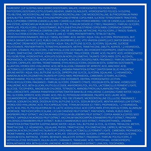 Detalles: Objetivos para el cuidado de la Presentamos el kit Besties, lleno de una rutina completa de cuidado de la piel que incluye nuestra crema hidratante Hyaluronic Blue Water Bank, suero, espuma limpiadora, máscara de dormir labial más vendida en bayas y máscara para dormir de agua. ¡Revela la piel hidratada sobre la marcha! Tipos de piel: Seca, Normal, Aceitosa, Combinación Piel Visible Preocupaciones: Sequedad, Dullness, Textura desigual Cómo usar: 1. Masajea la cantidad deseada del limpiador hialurónico Blue Water Bank en la cara húmeda y luego enjuaga y limpia bien la piel con agua tibia. 2. Aplica el suero hialurónico Blue Water Bank uniformemente sobre la cara después de la limpieza. 3. Masajea la crema hidratante hialurónica Blue Water Bank sobre la piel después del suero. 4. Después de aplicar la crema hidratante, aplica la máscara para dormir de agua uniformemente en la cara y déjala actuar durante la noche. Limpiar suavemente o limpiar por la mañana. 5. Con el aplicador, aplica la máscara de dormir labial a los labios por la noche y déjala durante la noche. Limpiar suavemente o limpiar por la mañana. Aspectos destacados de los ingredientes: Berry Fruit Complex: Rico en antioxidantes para ayudar a revelar labios suaves y flexibles. Ácido hialurónico azul: Ofrece una hidratación eficaz y multifacética. Lactobacillus complejo derivado de probióticos lisado y trehalosa: ayuda a fortalecer la barrera contra la humedad.