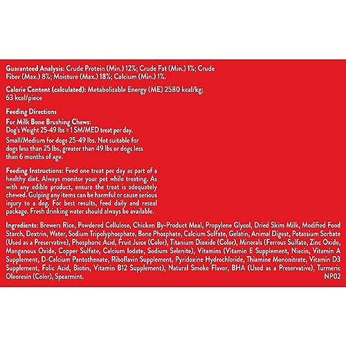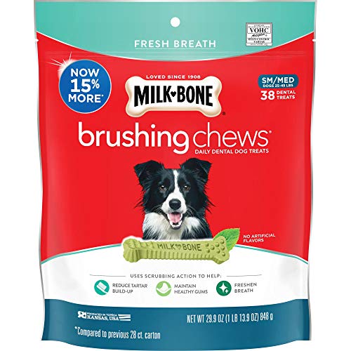 Detalles: Bad breath can keep you and your dog from the closeness you’ve always enjoyed. Now you can help keep your canine friend’s breath fresh with Milk-Bone brushing Chews daily dental treats. These chews feature unique nubs and ridges that are designed to clean Like bristles on a toothbrush*, helping control tartar and plaque buildup through scrubbing action. Made with no artificial flavors and sealed for freshness, These chews have an irresistible minty taste your dog will love. They are fortified with calcium to help support strong bones and teeth-andd have no Artificial flavors. *When fed daily Milk-Bone brushing Chews are as effective as brushing a dog's teeth twice a week based on the reduction of tartar build-up. The Veterinary Oral Health Council recommends daily tooth brushing for optimal effectiveness.