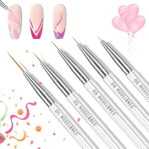 Modelones Juego de brochas para decoración de uñas, esmalte de gel, diseño de uñas, bolígrafo con limpiador de brochas y acondicionador para líneas largas, detalles, diseños de arte de uñas, mango de forma hexagonal, tamaños 5/7/9/11/20 mm