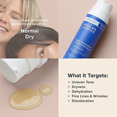 Detalles: El sérum concentrado superantioxidante de Resist contiene una impresionante gama de antioxidantes derivados de plantas y vitaminas que funcionan sinérgicamente para mejorar visiblemente la apariencia de arrugas, tono desigual de la piel, sequedad y vitalidad. Es una innovadora mezcla de ingredientes probados por investigación para ayudar a la piel a verse más joven y renovada. La vitamina C estabilizada y los péptidos además de potentes antioxidantes se combinan para ayudar a preservar y rejuvenecer la superficie de la piel y mejorar visiblemente la firmeza. Este suero de última generación ayuda a minimizar el daño causado por el ataque ambiental que hace que la piel se vea más vieja, mientras que también ayuda a mejorar visiblemente un tono de piel opaca para obtener resultados suaves y radiantes. Todos los productos de Paula's Choice son 100% libres de fragancia, no irritantes y nunca probados en animales.