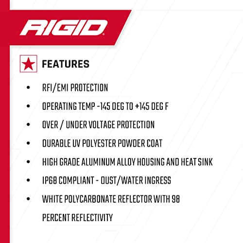 Detalles: Iluminación LED de escena de RIGID ya está disponible para cualquier aplicación de iluminación de área que utilice alimentación de CA. Utilizando la última tecnología LED, RIGID perfecciona su innovador diseño robusto, disipador térmico optimizado térmicamente, salida extrema, y lo hace con un consumo mínimo de amplificador para la solución de iluminación total. Con una extensión horizontal de 115 grados, este producto iluminará perfectamente el área circundante.