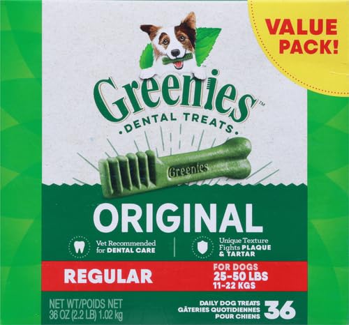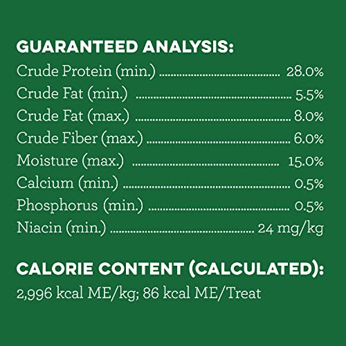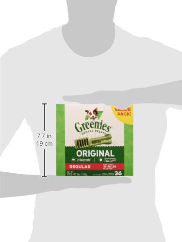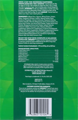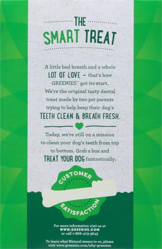 Detalles: Descripción Exciting news from Greenies. Now your dog's favorite dental treat features a chewy texture! New Greenies Treats offer dogs a better chewing experience with the same great taste and dental benefits. New Greenies treats feature a new design with natural break points. The natural break points assist dogs with biting off chewable pieces that dissolve easily in a dog's digestive system. Greenies treats continue to help clean teeth, whisk away plaque and tartar, and eliminate offensive "doggie breath." With vitamins and minerals to make Greenies 100% complete and nutritionally balanced for adult maintenance, this treat has the same great Greenies taste dogs love!